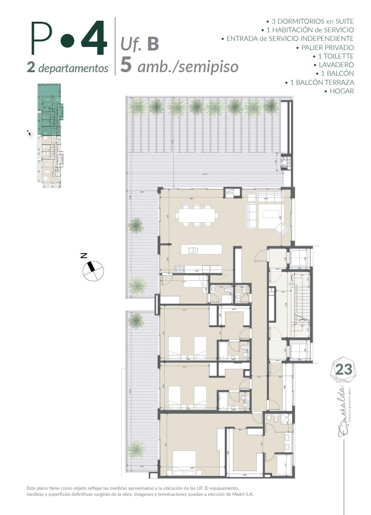 Exclusivo semipiso 5 ambientes con gran terraza y vista abierta Espectacular unidad de categoría, con palier privado, doble circulación y excelente distribución, pensada para quienes buscan amplitud y vida indoor-outdoor. Cuenta con un amplio living comedor con cocina integrada y gran isla, con salida a un increíble balcón terraza de generosas dimensiones, ideal para armar un verdadero espacio de exterior con living, comedor y parrilla. Dispone de tres dormitorios en suite, incluyendo una cómoda suite principal. Además, cuenta con dependencia de servicio con baño, toilette de recepción y lavadero independiente. La propiedad se destaca por su gran terraza y un segundo balcón, logrando múltiples espacios al aire libre y excelente luminosidad en todos los ambientes. Detalles y terminaciones: Pisos de porcelanato de primera calidad Carpinterías de PVC con DVH (Doble Vidrio Hermético) Calefacción por losa radiante Aire acondicionado frío/calor por ambiente Parrilla con frente de acero inoxidable Interiores de placard completos Cortinas: Sistema Roller Screen en living / comedor. Sistema Roller Black Out en dormitorios. Amenities y edificio: SUM Espacio de coworking Gimnasio equipado Ascensores de última generación Cocheras de cortesía Cargadores eléctricos de vehículos Piscina Exterior Piscina Indoor climatizada Vestuarios Parque Sobre el proyecto: ubicado en Puerto Escondido, uno de los desarrollos más buscados de Nordelta, que combina diseño contemporáneo, excelente calidad constructiva y una ubicación privilegiada dentro del complejo, con cercanía a centros comerciales, gastronomía y servicios. Ideal para quienes buscan confort, seguridad y calidad de vida. El valor es en efectivo. Posibilidad de financiamiento: 50% al boleto U$S765.600.- y 24 cuotas de U$S31.900.- total de U$S1.531.200.- YS CMCPSI6421